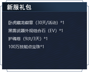 活动内容: 活动期间输入兑换码【卧虎藏龙】获得礼包,每个账号只能获得一次