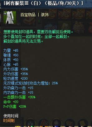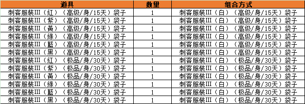 备注:刺客服裝(白)(高级/身/15天)袋子、刺客服裝(白)(极品/身/30天)袋子,可组合成(红、紫、黄、绿、蓝、黑)6种其他颜色刺客服装,无需副材料直接组合即可